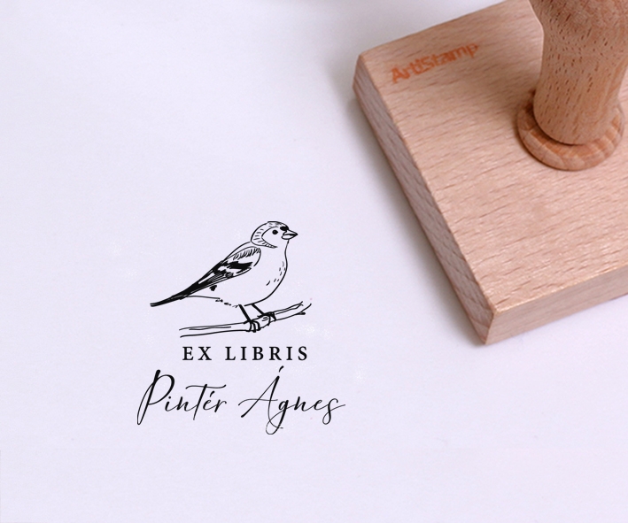 ![Ex libris pecsét, csigaházat ábrázoló grafikával. Nyeles fa alapra készült, gumi lenyomattal, egyedileg megadott névvel készült.]()