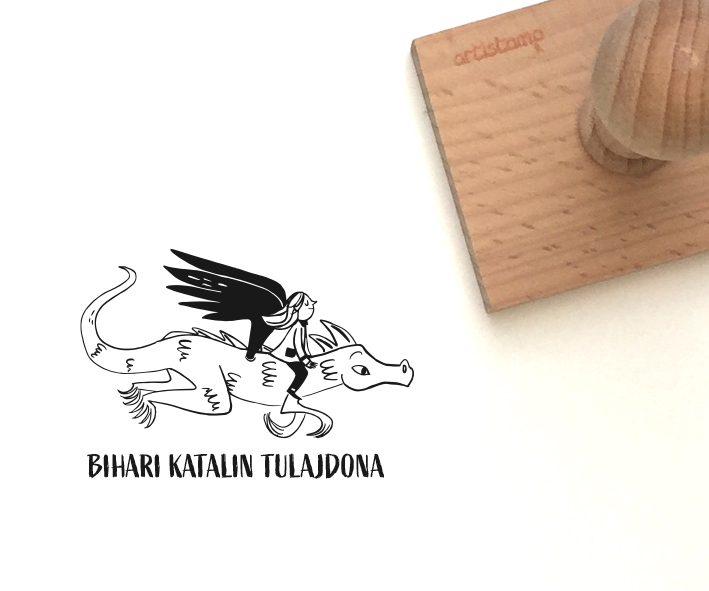![Ex libris pecsét, szitakötőt ábrázoló grafikával. Nyeles fa alapra készült, gumi lenyomattal, egyedileg megadott névvel készült.]()