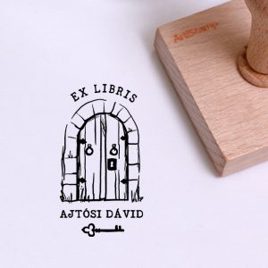 ![Ex libris pecsét, erdőben, könyvet magához ölelő varázsló, kezében varázspálcával ábrázoló grafikával. Nyeles fa alapra készült, gumi lenyomattal, egyedileg megadott névvel készült.]()