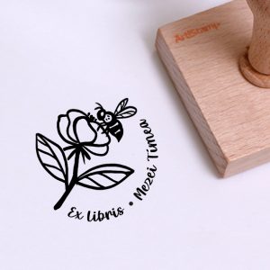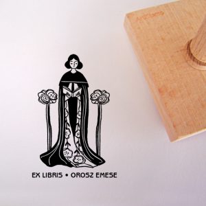 ![Ex libris pecsét, könyvet magához ölelő, tóparton ülő nimfát ábrázoló grafikával. Nyeles fa alapra készült, gumi lenyomattal, egyedileg megadott névvel készült.]()