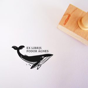 ![Ex libris pecsét, hal királyon ülő, olvasó lányt ábrázoló grafikával. Nyeles fa alapra készült, gumi lenyomattal, egyedileg megadott névvel készült.]()