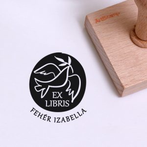 ![Ex libris pecsét, 3 könyv tetején, egy gőzölgő kávéscsészét és alvó baglyot ábrázoló grafikával. Nyeles fa alapra készült, gumi lenyomattal, egyedileg megadott névvel készült.]()