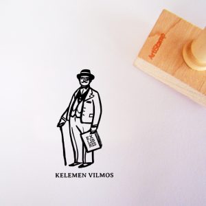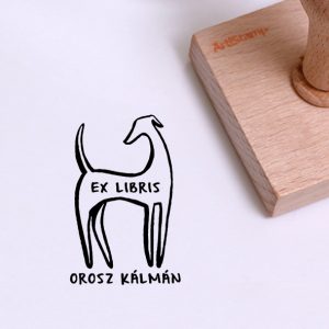![Ex libris pecsét, két lábon álló róka ruhában, mellette szövegbuborékban XY tulajdona grafikával. Nyeles fa alapra készült, gumi lenyomattal, egyedileg megadott névvel készült.]()