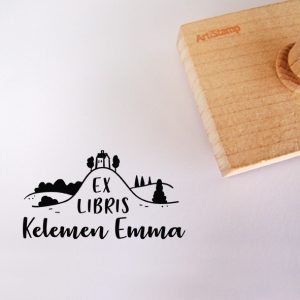 ![Ex libris pecsét, olvasó sárkányt ábrázoló grafikával. Nyeles fa alapra készült, gumi lenyomattal, egyedileg megadott névvel készült.]()